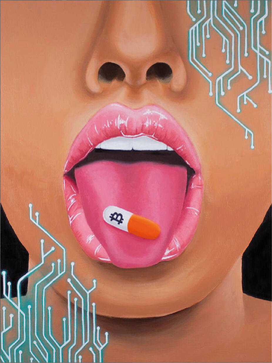 consciousness, and the transformative power of the Bitcoin pheno-menon. The mouth represents our collective voice, our ability to com-municate, and the power of human expression. The iconic "orange pill," a visual metaphor represents the profound awakening and immersion into the world of Bitcoin. This piece encourages contempla tion of the impact of digital currencies on our economic structures, personal freedoms, and the potential for financial empowerment.