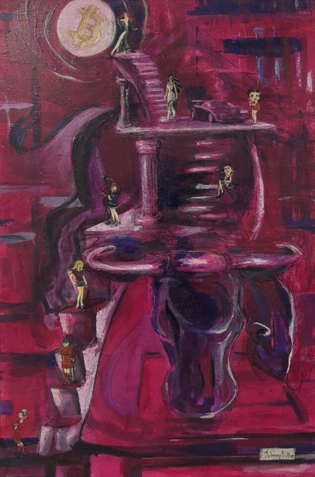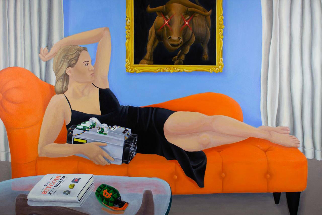Within this collection of acrylic paintings, Sarah Foster draws upon her appreciation of art history, reinterpreting its iconic imagery, motifs, and concepts within the context of Bitcoin. By incorporating Bitcoin symbolism, such as an "orange pill" or Antminer 59, into compositions, she creates visual narratives that reflect the dynamism and possibilities this technology represents. The vibrant colors and use of acrylic medium enhance the visual impact of her artwork, enhancing it with energy and vitality. Sarah Foster is a visual artist living in Kansas City, Missouri and creates primarily in acrylic and ceramic. She received her BA of Visual Arts and BA of Science in Art